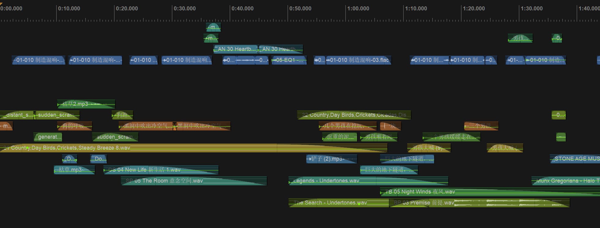 上述过程,相比于写稿,对我来说是最简单,也是相对最享受的一件事,我会享受在其中创造出一个完整的听觉世界的过程。比如《被回声塑造的人类》的开场工程,你能看到虽然只有1分半,但我找了非常多的音效和音乐甚至AI生成的场景,让它的听感更沉浸。而这1分半大概花了我将近2小时(很大一部分是用AI生成音效的挑选和提示词撰写)。